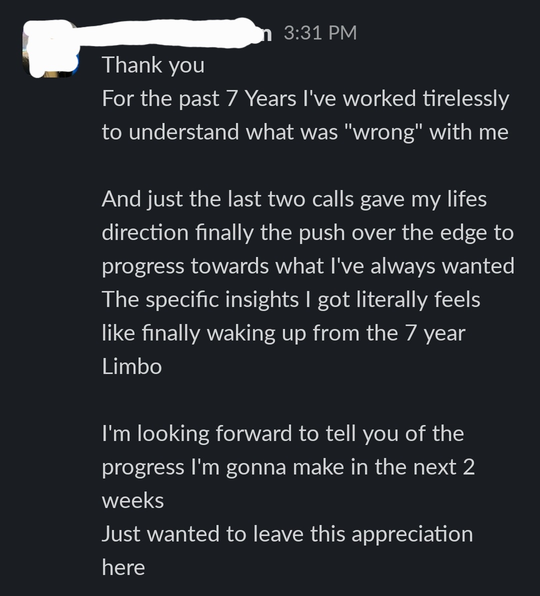 "That was my first time feeling guilt and judgement, and you pulling me out of that feels really freeing right now...But you saying that lifted a lot of weight off my back. I guess I was unconsciously really judging myself for those thoughts. THANKS MAN!!!! Really appreciate what you're doing 🙏🙏🙏🙏🙏